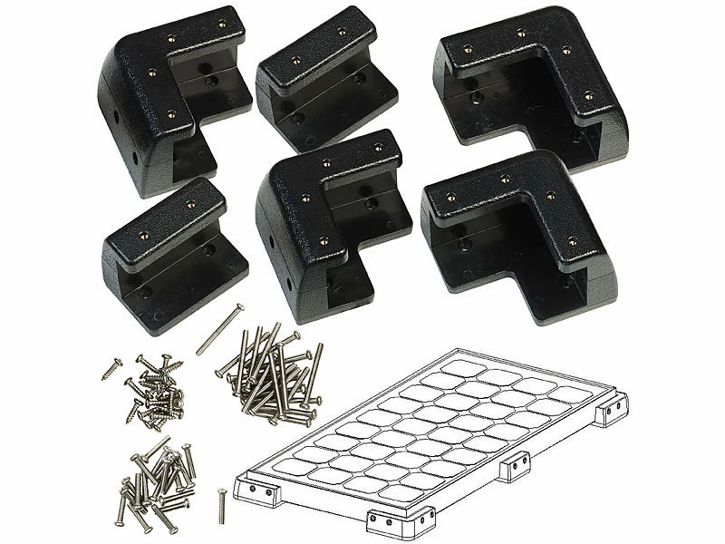 - 2 Montage-Sets bestehend aus 8 Eckhalterungen, 4 Seiten-Halterungen, 40 Befestigungsschrauben, 40 Schrauben für 35 mm Rahmen-Höhe, 40 Schrauben für 18 – 40 mm Rahmen-Höhe und deutscher Anleitung – Solarbefestigung – Außerdem relevant oder passend zu: Set, Solar