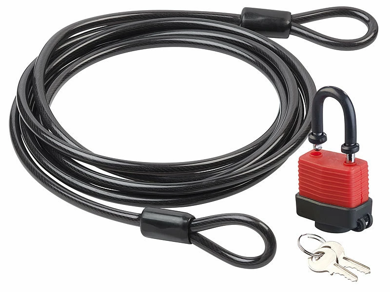 Extra lang: Dank 5 Metern Länge können Sie auch große und breite Gegenstände mit dem Stahlseil sichern. Befestigen Sie das Vorhängeschloss in der Schlaufe und nutzen Sie zwei Schlüssel zum Öffnen und Schließen.