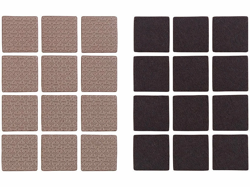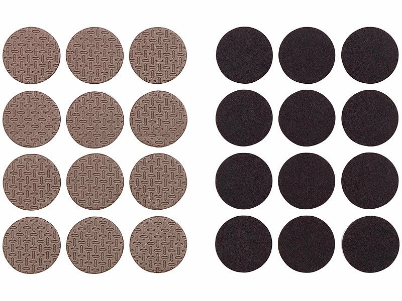 - Filzgleitergrößen: je 12x rund Ø 22 mm, 12x rund Ø 25 mm, 9x rund Ø 32 mm, 6x rund Ø 40 mm, 12x rechteckig 25 x 25 mm, 4x rechteckig 38 x 38 mm