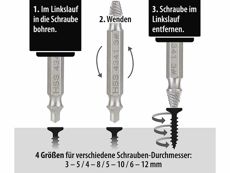 Das kennen Sie sicher auch: Gerade wenn Sie mit einem Akkuschrauber arbeiten, ist schnell mal ein Schraubenkopf beschädigt und lässt sich nicht mehr lösen. Dank des Ausdreher-Sets aus hartem HSS-Stahl ist damit jetzt Schluss!