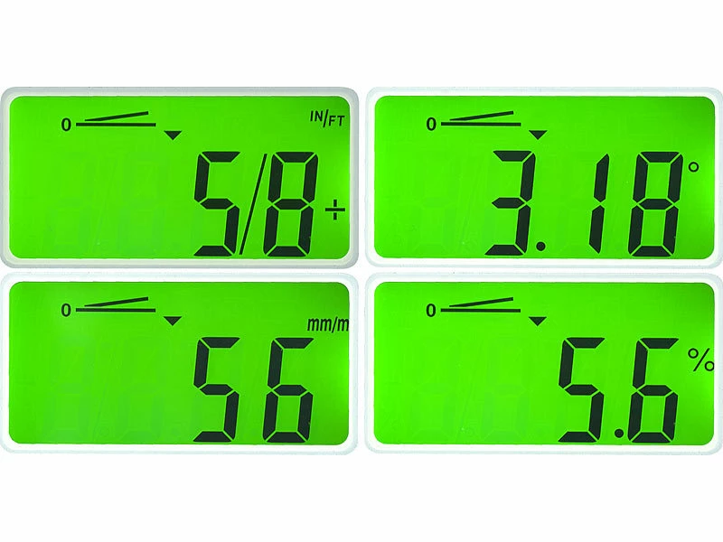 - Messwert-Anzeige in Grad (°), Prozent (%), Millimeter/Meter (mm/m) und Inch/Fuß (in/ft)