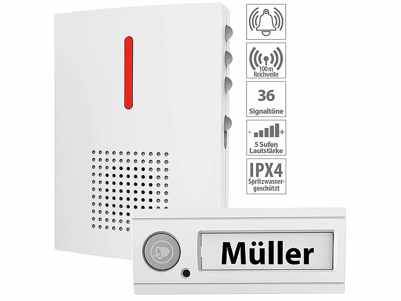 - Beliebig erweiterbar mit zusätzlichen Empfängern und jeweils bis zu 4 Klingelknöpfen