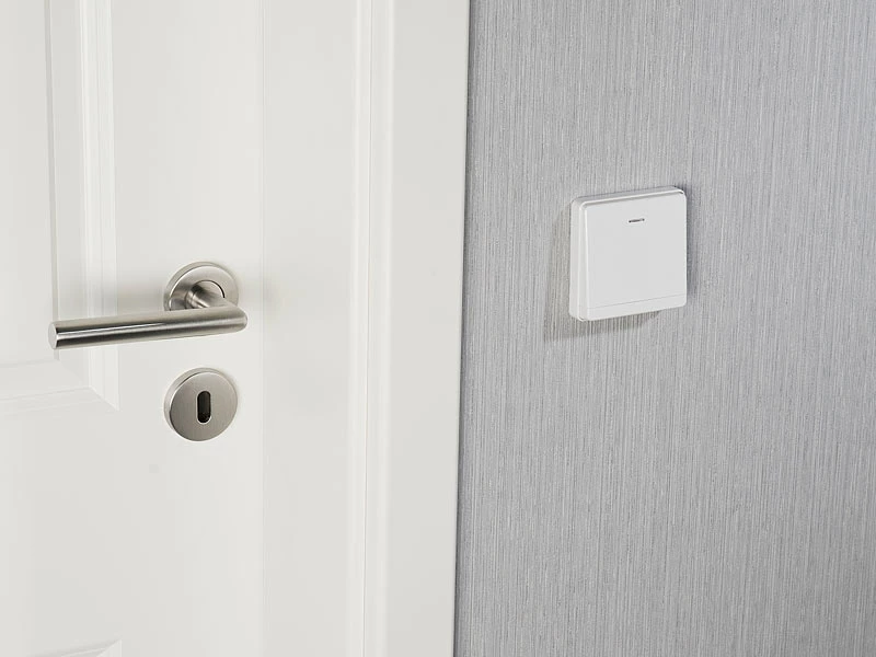 Kabel- und stromlose Installation: Kleben oder schrauben Sie den Funk-Taster einfach an die Wand oder den Türrahmen. Er braucht keine separate Stromversorgung. Denn er löst beim Drücken durch Bewegungs-Energie aus!