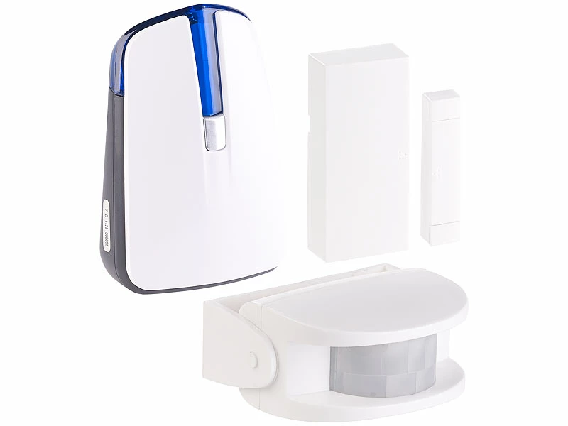 - Alarm-Set: Funkklingel (Empfänger) inklusive Bewegungsmelder, Tür- und Fensteralarm mit Knopfzelle (CR2032), Montagematerial und deutscher Anleitung