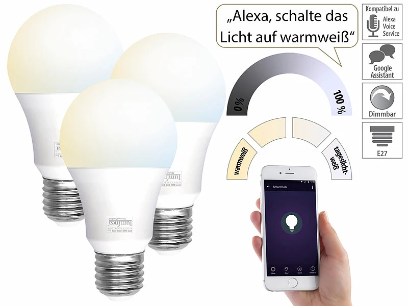 - 3 Lampen LAV-110.w inklusive deutscher Anleitung – Alexa-Licht – Außerdem relevant oder passend zu: iPad, 110 w, Birne, Birnen, Service, Smart Home, Deckenlampe, Vollspektrum, Funkschalter, Funkgesteuerte, iPhone Smartphone, Glühbirne dimmbar, Leuchtmittel kaltweiß, Lampenfassung Schalter