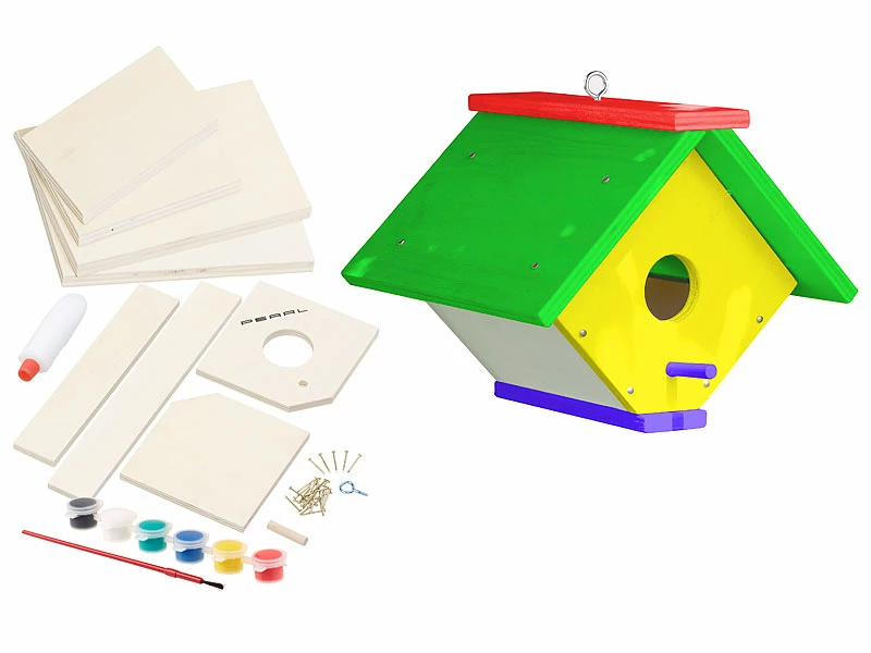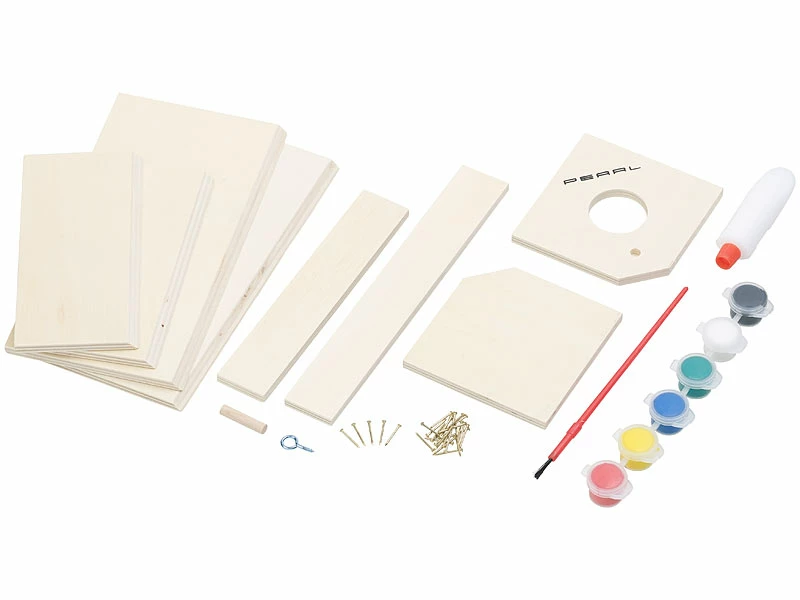 - 9-teiliger Vogelhaus-Bausatz inklusive 6 Farben, Pinsel, Nägeln, Leim, Aufhänge-Haken und deutscher Anleitung – Vogelhäuser – Außerdem relevant oder passend zu: Nist, Eier, Malen, Farbe, Vogel, Basteln, Frühling, Baukasten, Geschenke, Spielzeug, Futterhaus, Geschenkidee, vogelhauschen, Kinder Garten, Geschenkideen