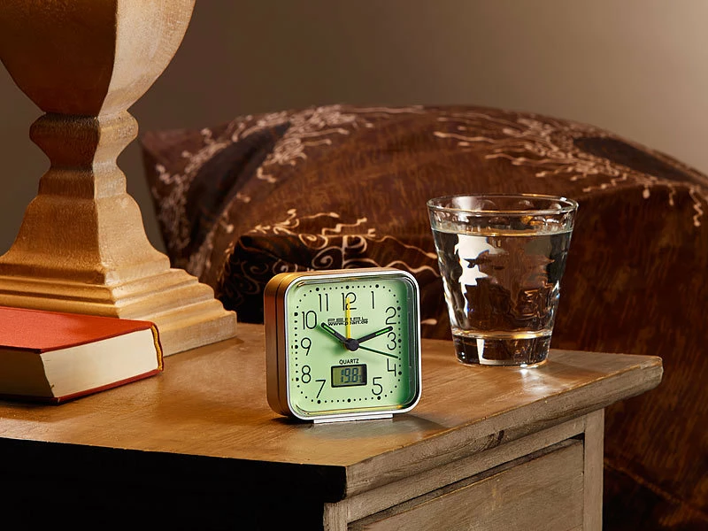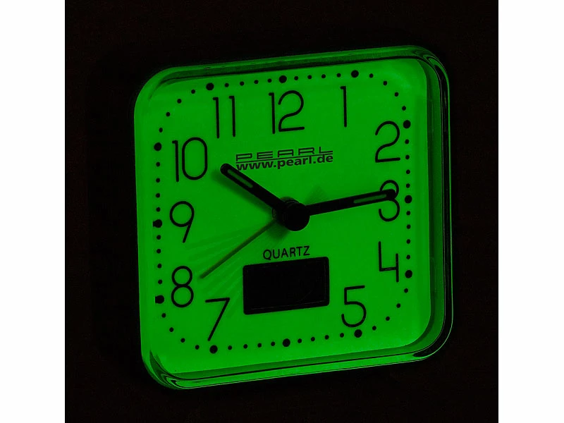 - Kompakter Reisewecker mit nachleuchtendem Ziffernblatt und Zeiger