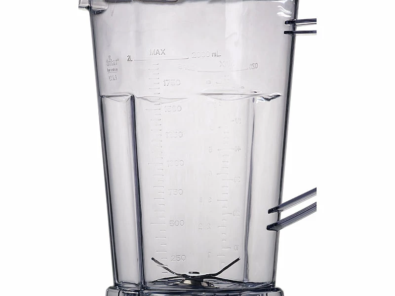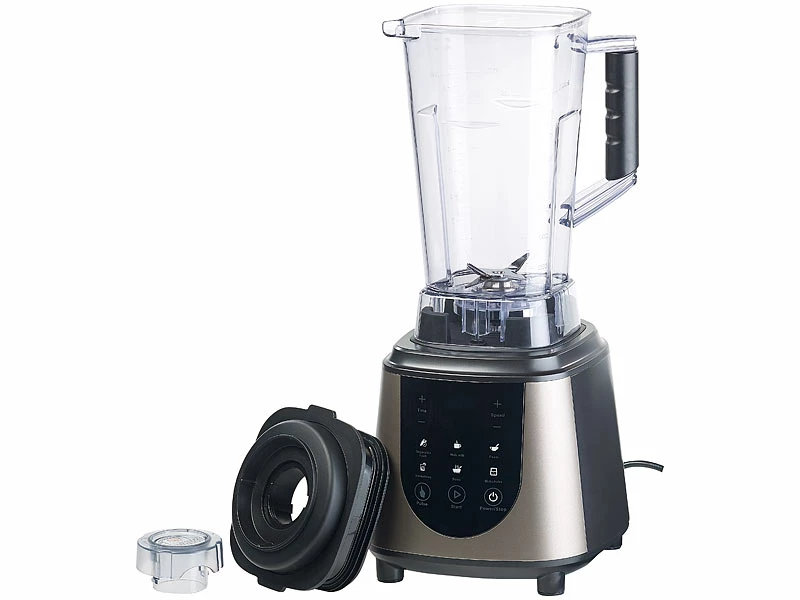 - Skalierter Mixbecher bis 2 Liter, mit gummiertem Deckel, Öffnung zum nachträglichen Einfüllen und Drehverschluss zum Frischhalten des Inhalts
