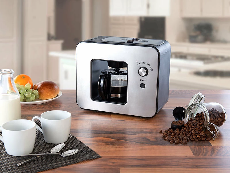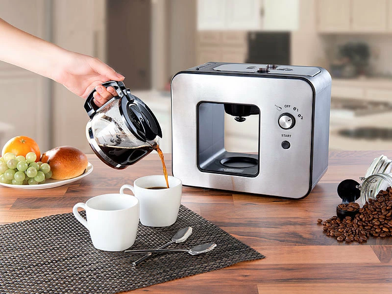 Frischer Bohnenkaffe im Handumdrehen: Ihre neue Design-Kaffeemaschine ist Kaffeemühle und Kaffeemaschine in einem. So mahlen und brühen Sie aromatischen Kaffee mit nur einem Gerät.