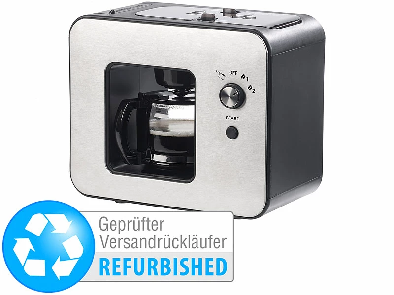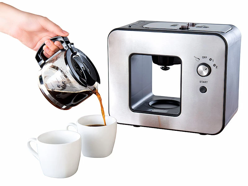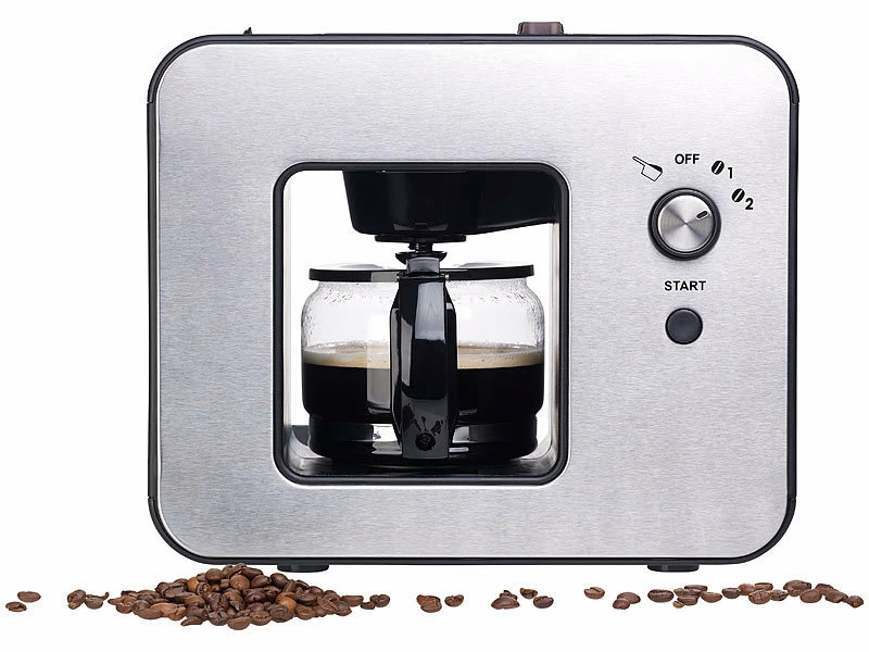 - Kaffeemaschine inklusive Glas-Kanne, zwei Permanent-Filtern, Reinigungs-Pinsel und deutscher Anleitung