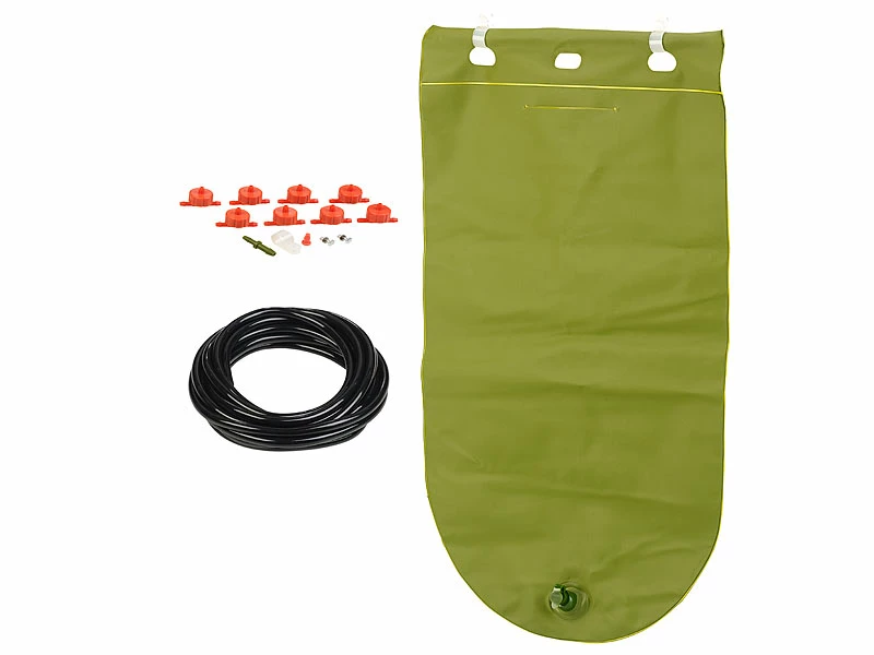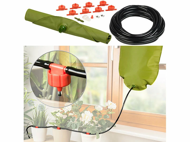 - 2 Wassertanks inklusive 2 Schläuchen, 16 Tropfern, 2 Endstücken, 2 Verbindungsstücken, Montage-Material und deutscher Anleitung – Bewässerung Sack – Außerdem relevant oder passend zu: Blume, Pflanz, Blumen, Garten, Urlaub, bewässer, Gießhilfe, Blumentopf, Mitbringsel, Perlschlauch, Topfpflanzen, Tropfschlauch, Perlschläuche, Minigewächshaus, Baumbewässerung