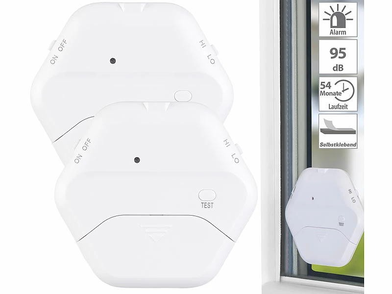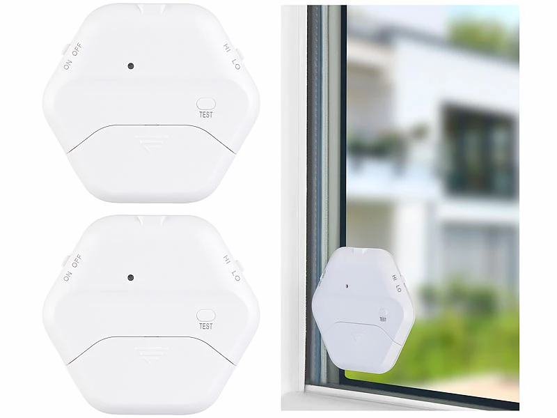 Kinderleichtes Handling: Kleben Sie die Melder im Handumdrehen an Ihre Scheiben. Je ein Klebepad ist auf jedem Melder vormontiert. Stellen Sie noch die Empfindlichkeit ein. Fertig!